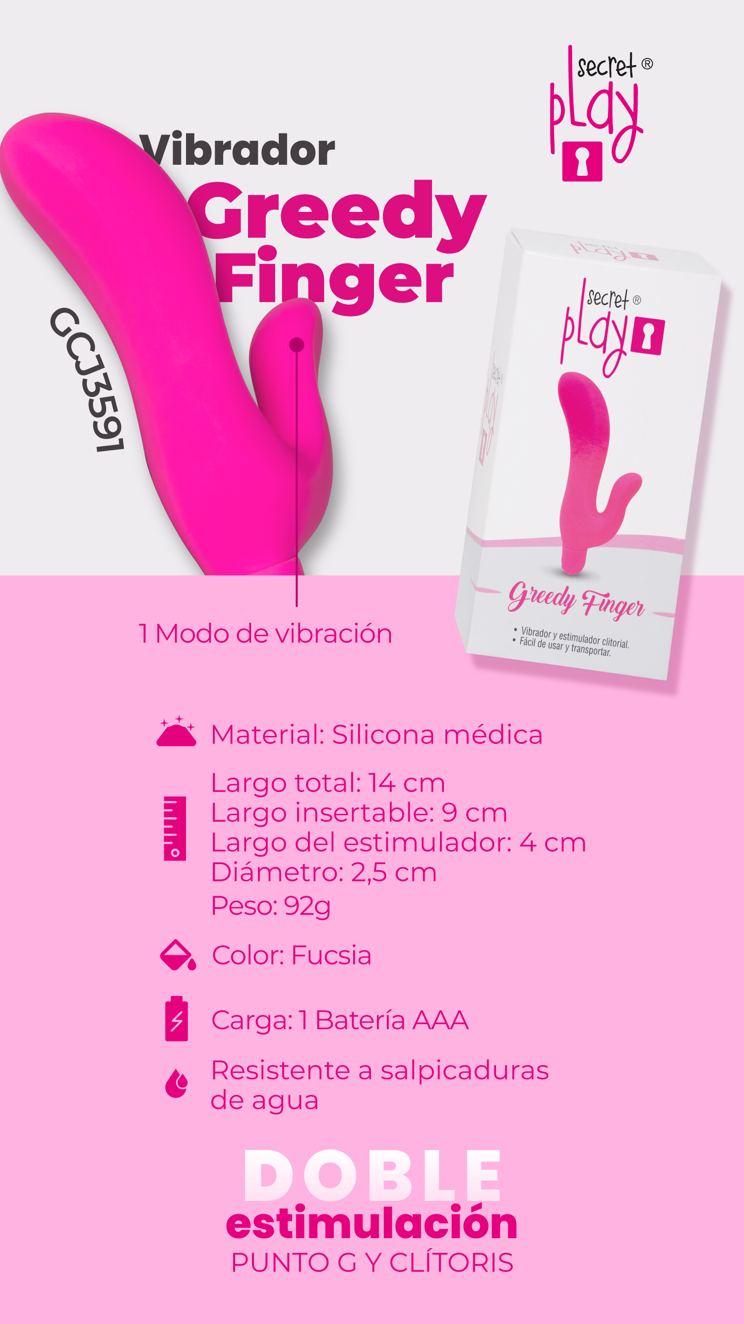Dale un toque de diversión a tu encuentro íntimo con este vibrador de doble estimulación, punto g y clítoris.